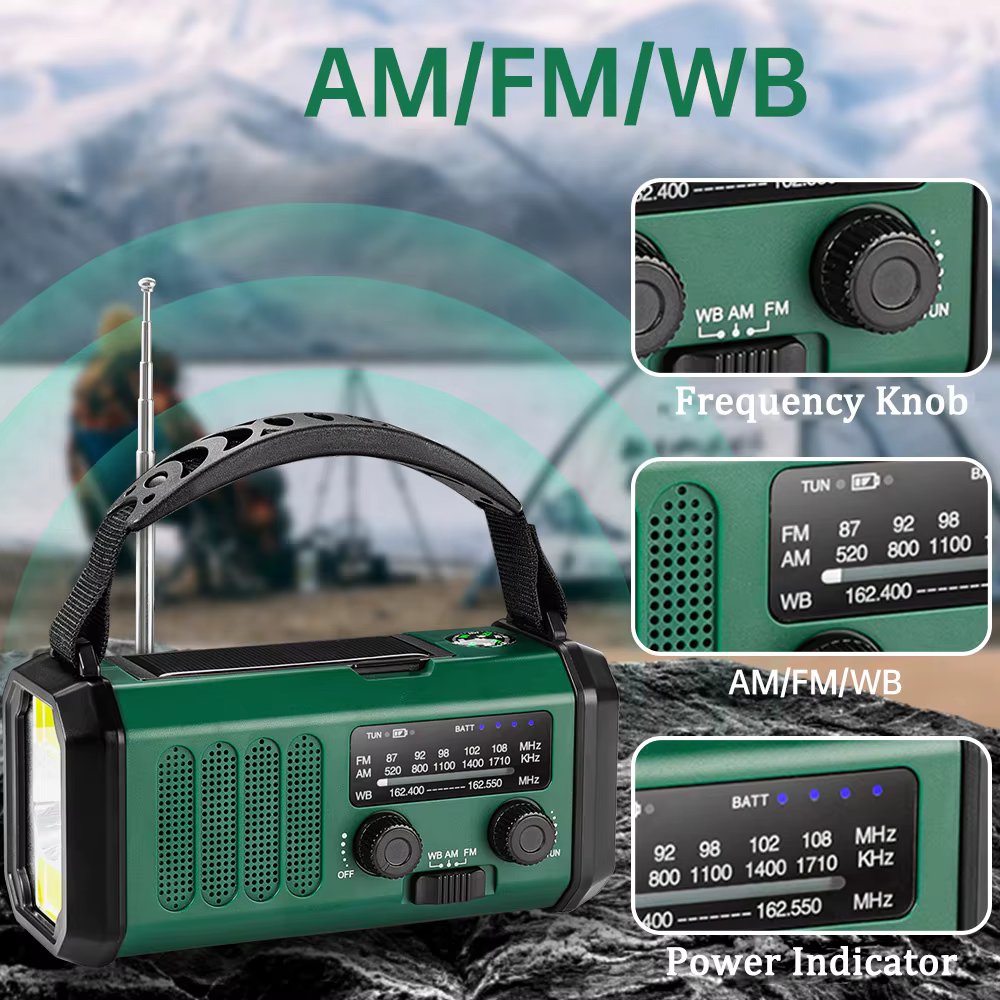 STAY SAFE AND PREPARED WITH RELIABLE WEATHER ALERTS, EMERGENCY LIGHTING, AND DEVICE CHARGING ANYTIME, ANYWHERE USING PREMIUM SOLAR RADIO AND POWER BANK.