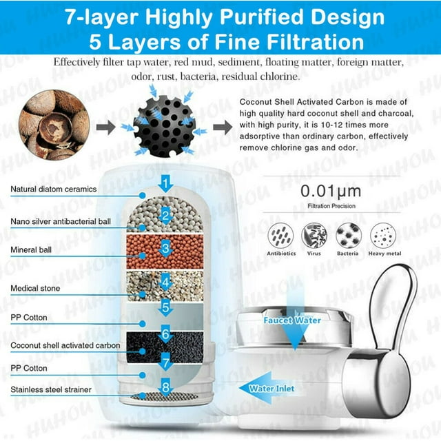 The outer layer of our household water faucet purifier is natural deep-sea diatom porcelain, and the inner layer is high-density activated carbon and pP cotton. reduces residual chlorine and remove sand, plankton in the water. intercept harmful substances, live a healthy life, start with water purification, and protect the health of family members. 0.1 micron purification filter element.
